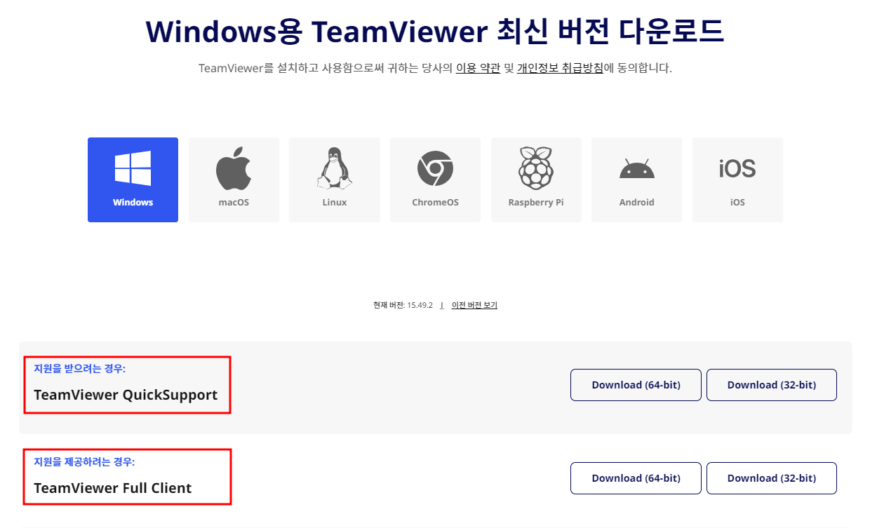 팀뷰어를 다운로드 할 때는 제어를 받을 기기인지, 제어를 제공할 기기인지에 따라 맞는 설치 파일을 다운로드 해야 합니다.
