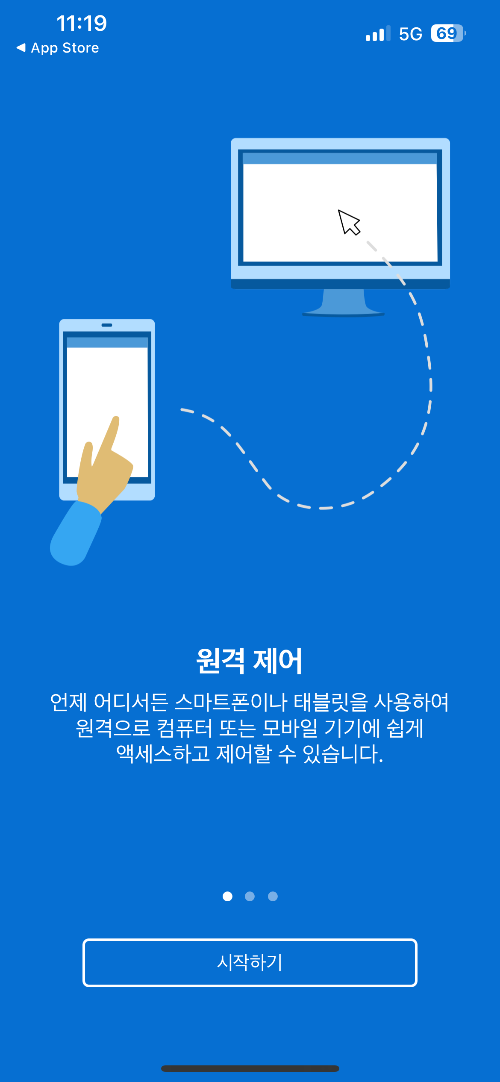 2. 모두 동의에 체크를 하고 [다음]을 누른 후, 원격 제어라는 화면이 나타나면 [시작하기]를 눌러주세요.